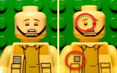 | The Antilles figure from set 75387 (on the left) has a larger rank patch than the previous versions (on the right). Also the lines round the eyes differ from the previous version. | |