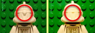 | Sets 7671 contained two variants of the phase II helmet. One with a knob on the back (on the left) and one without the knob (on the right). | |