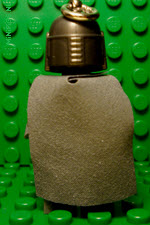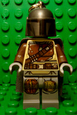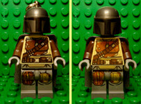 | The keychain variant of The Mandalorian minifigure (on the left) has a darker brown armor print than the original. | |