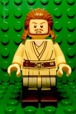 | The early releases of set 75383 contained a Qui-Gon figure with a reddish brown beard, eyebrows and moustache print (on the left). It was later replaced with a variant with a dark brown print (on the right). | |